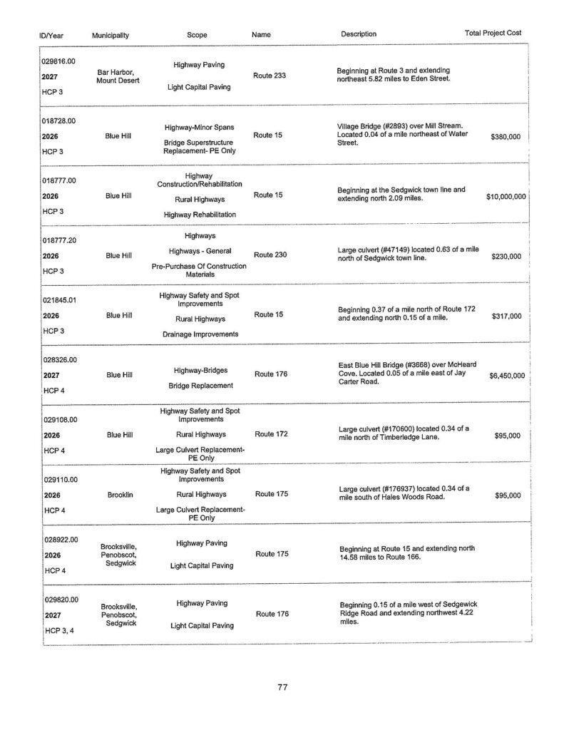 The Town has received a MaineDOT 2026 Work Plan, identifying the department’s plans for work on state (and state-aid) roads this year. Presented below is the portion of the plan relating to Blue Hill: