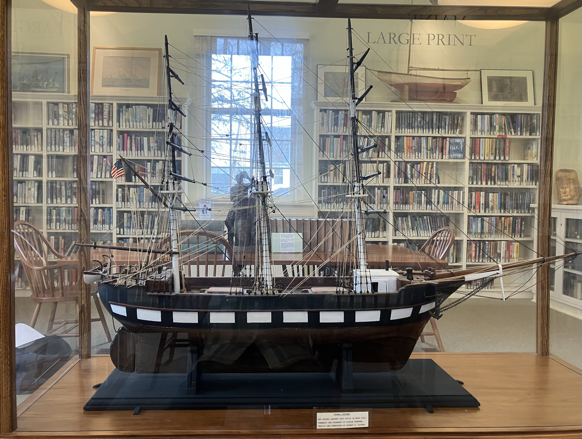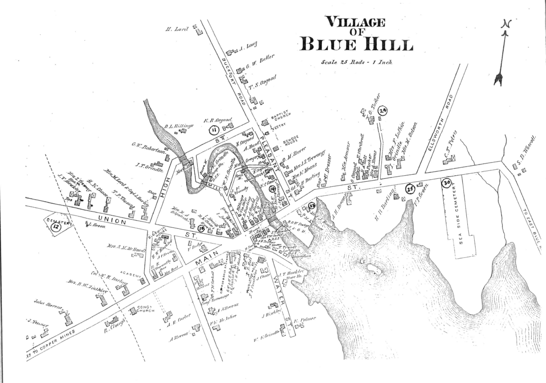 In the early part of the nineteenth century four dams were built on the Mill Stream, powering a sawmill, a cooperage, a grist mill, and other industries. The surrounding forest was cut down and the logs were fed into the sawmills producing lumber for houses and ships. Blue Hill took its place in the heritage of American sailcraft with three shipyards in the inner harbor, two in the Tide Mill District, one in East Blue Hill and one on Peters Brook. Blue Hill captains sailed all over the world and brought back goods from China, Australia, South America, and the West Indies. These goods found their way into Blue Hill homes and may be still seen here and there. Blue Hill mariners brought back knowledge of faraway places and foreign ways and the town developed a worldliness that carries through to the present.