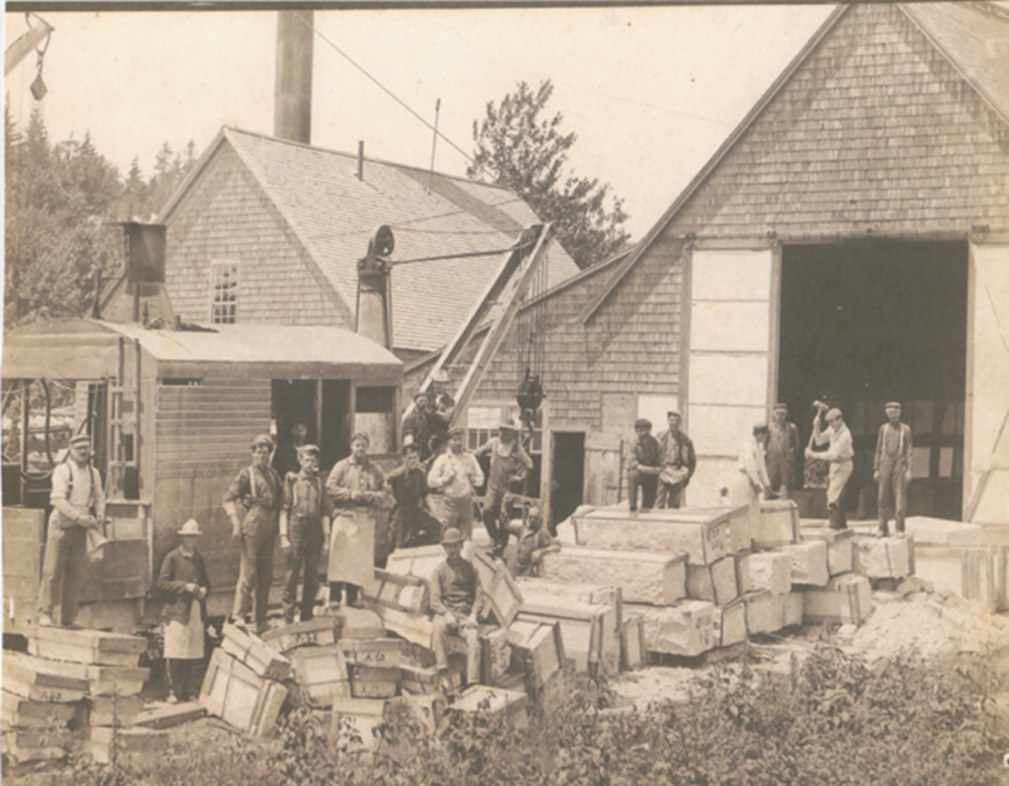 In the mid-eighteen hundreds steam power put an end to the age of sail and the town turned its focus away from the high seas and toward the granite bedrock. Quarrying became an important local industry. Jedediah Darling and his three sons provided the granite for the Congregational churches in Blue Hill and Ellsworth. They got out and roughly rounded eight columns for the Dutch Reform Church in New York that each measured twenty-eight feet long and four feet in diameter. Blue Hill granite was shipped all up and down the East coast and as far away as New Orleans. Granite quarries extended along the shore in East Blue Hill.